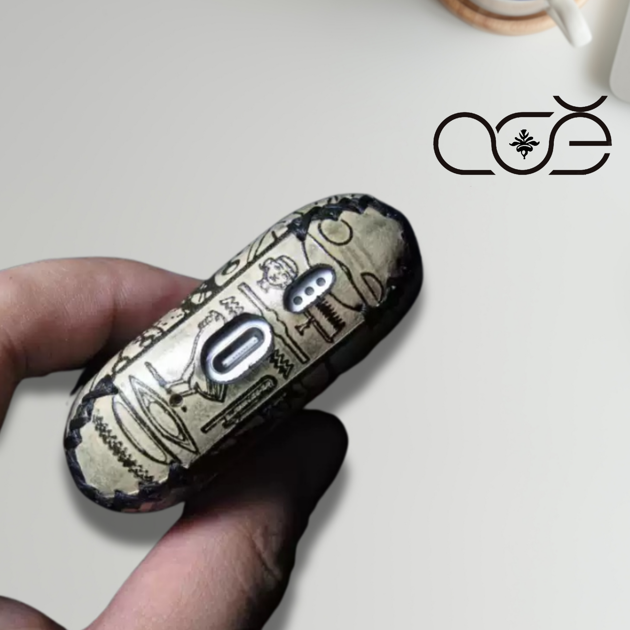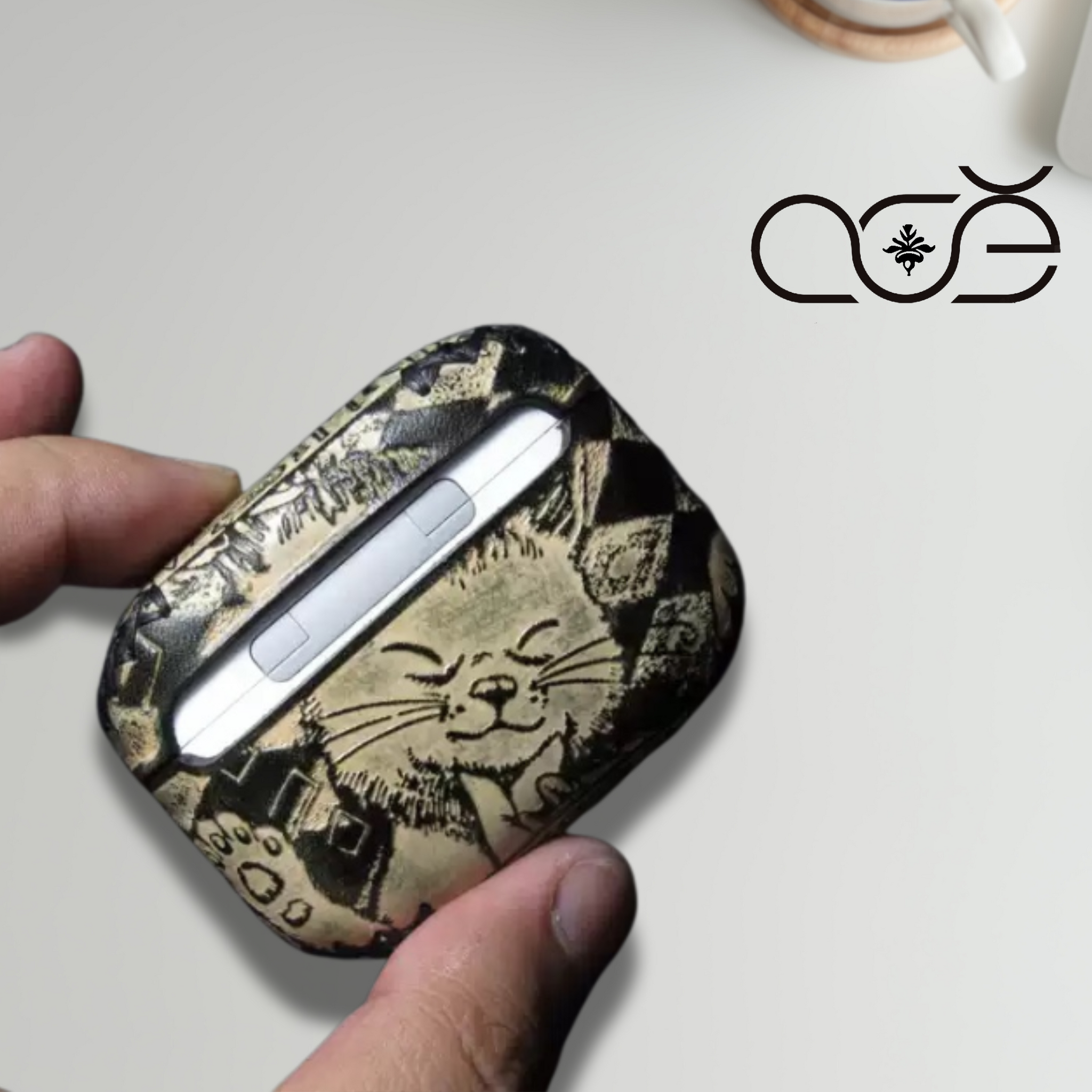 Handmade Vintage Cowhide Leather Earphone Case for AirPods Pro 3/ Pro 2/ Pro/ AirPods 3/ 4, Leather AirPods Case with Cat Pattern Embossing